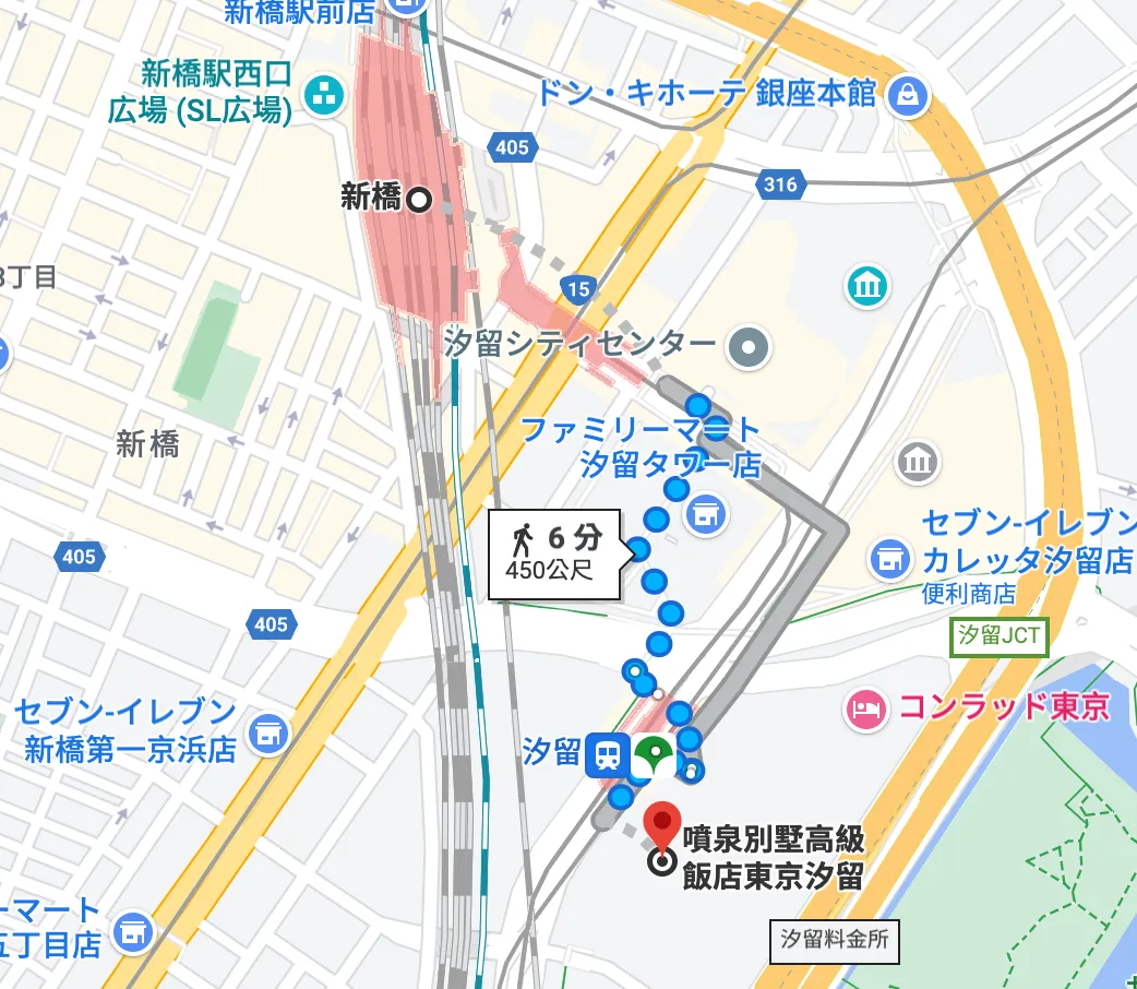 如果要去其他地点要走路到新桥站(大约 10 分钟),从新桥过到东京车站大约也是再 10 分钟 (1–2 站的距离)。