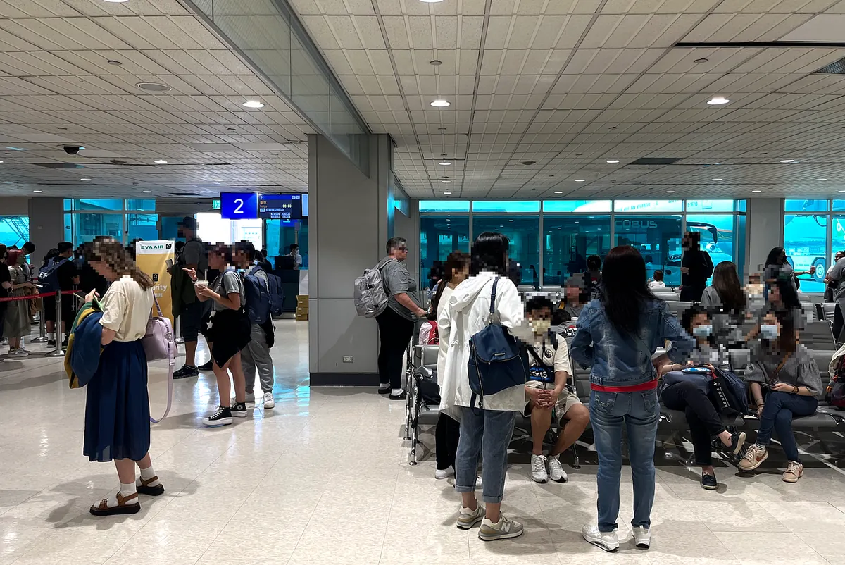 很热很挤,但还是到登机口了:
