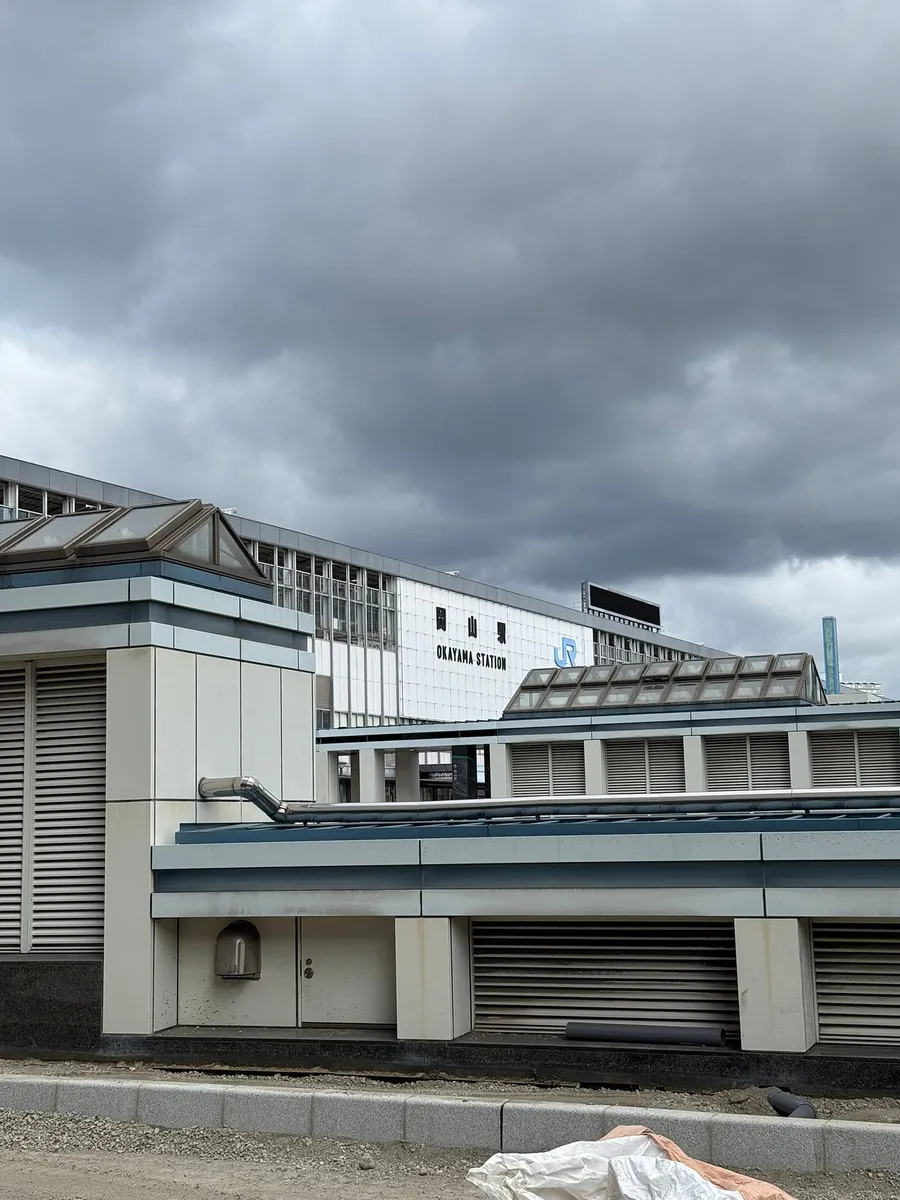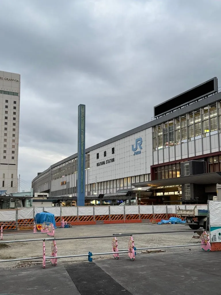 施工中的冈山站跟暂时被移到车站旁的桃太郎。