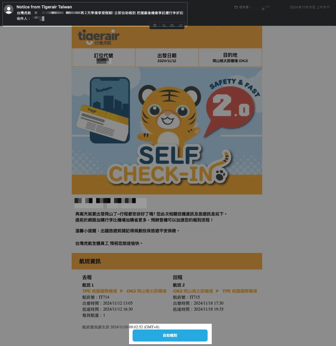 约出发前 1~3 天会收到虎航寄发的行程通知信, 务必!务必!务必! 在出发前直接完成线上「自助报到」: