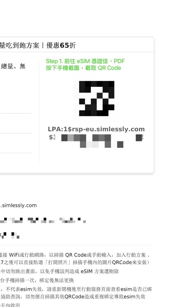 之前去 泰国买的 eSIM 可以直接在购买凭证信、PDF 或截图照片中长按 QR Code 出现「加入 eSIM」点击即可自动加入 ,但这次买的日本 eSIM 却没有出现: