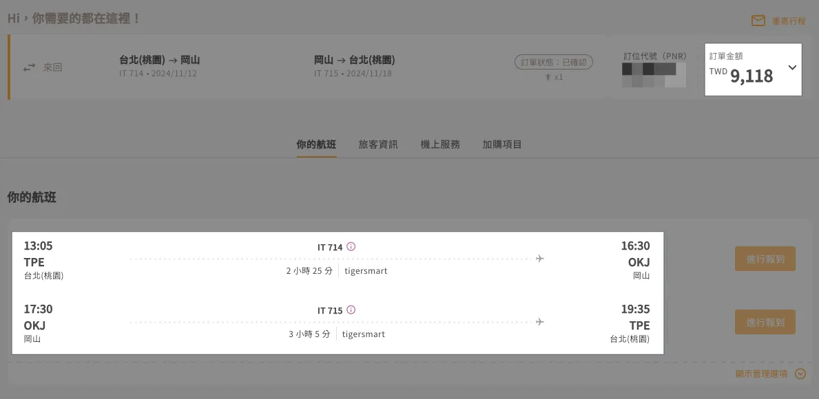 今年没有特别抢虎航秋季活动机票, 去年有买到优惠机票 时间比较好又比较便宜( 去年:去(11:10)、回(15:25),含来回 20KG 托运+选位+杂费:NT$ 7,012 )。