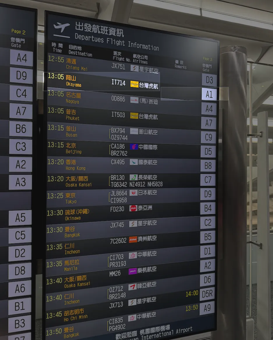 回: 17:30 OKJ 冈山桃太郎机场 -> 19:35 TPE 台北桃园国际机场