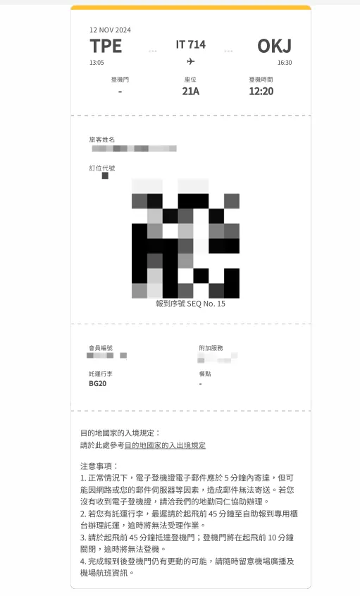 点击自助报到后会前往虎航官网,确认旅客资料、行李安全,最后会产生、寄发「登机证」。