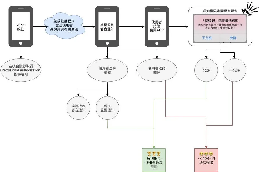 前陣子在改善APP推播通知允許及點擊率過低問題,做了些優化調整;最初版的時候體驗非常差,APP 安裝完一啟動就直接跳「APP想要傳送通知」的詢問視窗;想當然而關閉率非常高,根據前一篇使用 Notification Service Extension 統計通知實際顯示數,推測按允許推播的使用者只有大約10%.