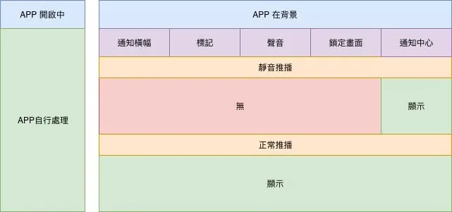 可以看到如果是靜音推播通知,APP在背景狀態下收到通知時 不會跳出橫幅、不會有聲音提示、不能標記、不會出現在鎖定畫面,只會出現在手機解鎖狀態下下拉的通知中心之中 :