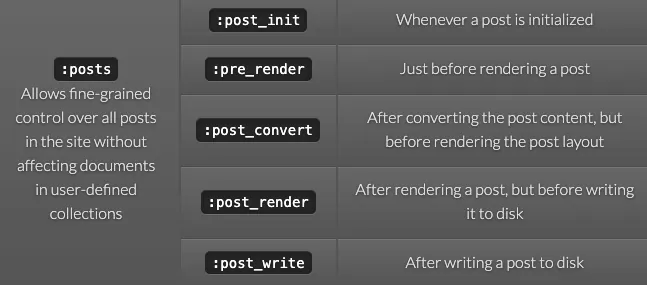 第二種方式是使用 Plugin 中的 Hook 方法,在 Jekyll 產生靜態內容階段注入自己想要的客製化內容。