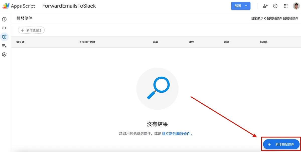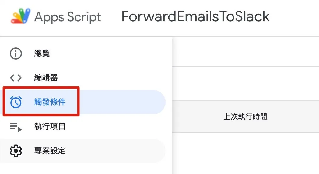 在 Apps Script 左方選單列,選擇「觸發條件」。