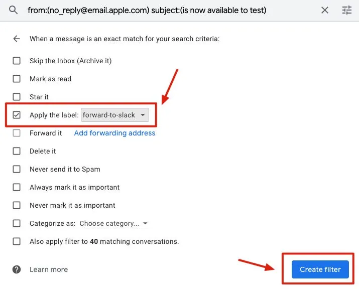 下一步設定符合此篩選條件是的動作,這邊我們選「Apply the label」建立一個獨立新辨識用 Label 「forward-to-slack」,點擊「Create filter」完成。