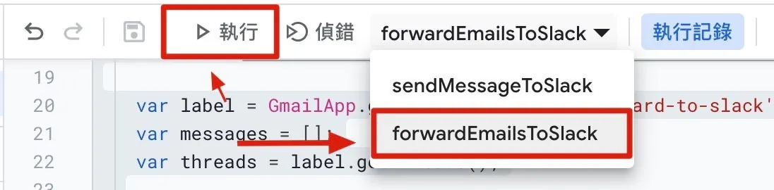 - 在 Apps Script 程式碼編輯器上選擇「forwardEmailsToSlack」然後點擊「執行」按鈕