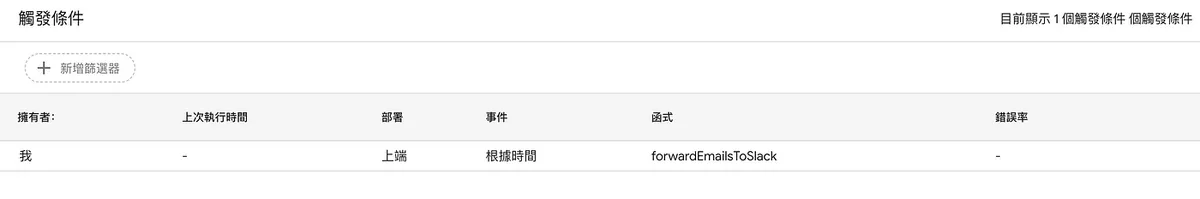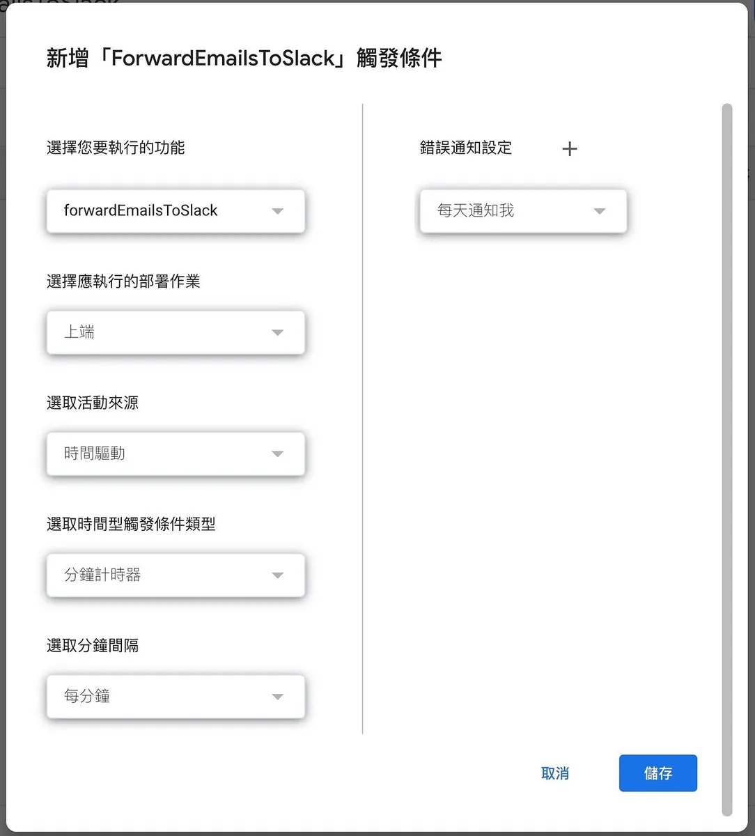 這邊為了示範設定成每分鐘執行一次,我覺得信件的即時程度可以設每小時檢查一次就好。