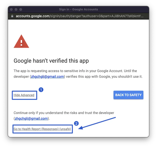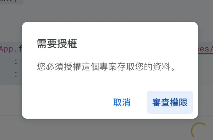 在身份驗證的過程中會出現「Google hasn’t verified this app」這是正常的,因為我們寫的 App Script 沒有經過 Google 驗證,不過沒關係這是寫給自己用的。