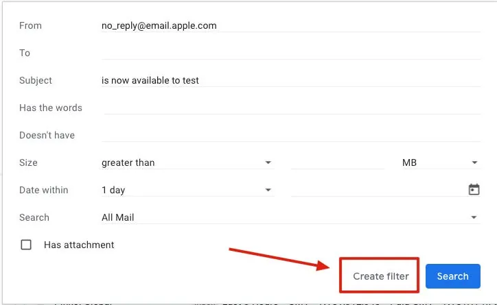 在 Gmail 點擊右上進階搜尋圖標按鈕,輸入要轉發的信件規則條件,例如來自: no_reply@email.apple.com + 主題是 is now available to test. ,點擊「Search」查看篩選結果是否如預期;如果正確可以點擊 Search 旁的「Create filter」按鈕。