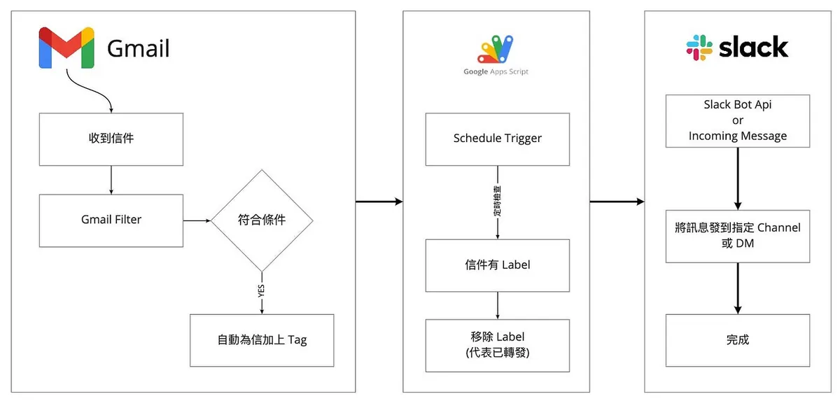 完整流程如上圖所示,原理上可行;但不是本文要討論的重點,本文將著重在收到信件、使用 Apps Script 轉發至 Slack Channel 部分。