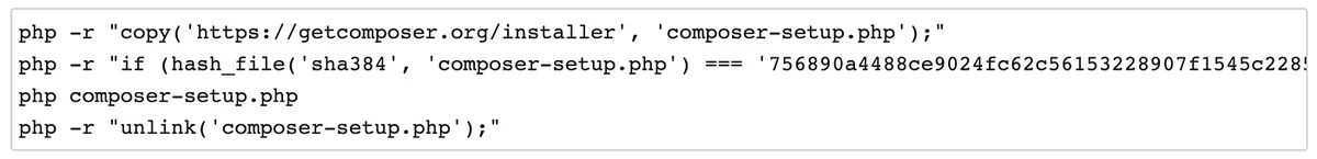 php -r "if (hash_file('sha384', 'composer-setup.php') === '756890a4488ce9024fc62c56153228907f1545c228516cbf63f885e036d37e9a59d27d63f46af1d4d07ee0f76181c7d3') { echo 'Installer verified'; } else { echo 'Installer corrupt'; unlink('composer-setup.php'); } echo PHP_EOL;"