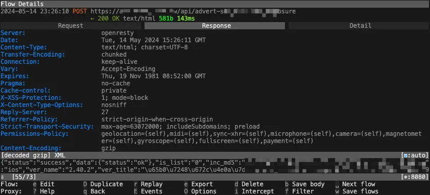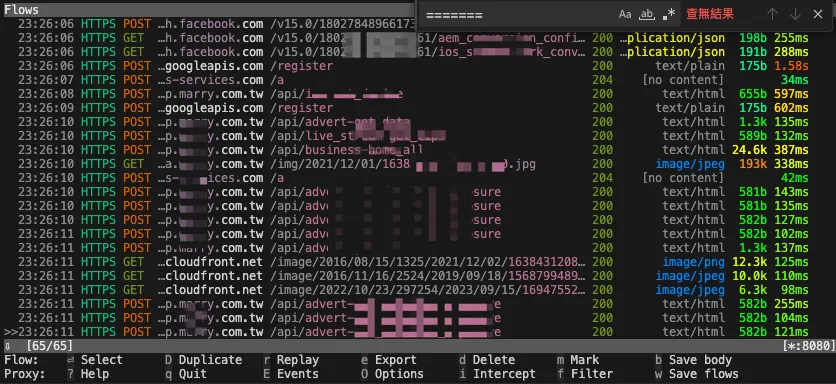 回到 Terminal mitmproxy,一邊操做手機上的 App 就能看到所有被捕捉的 API 請求紀錄。