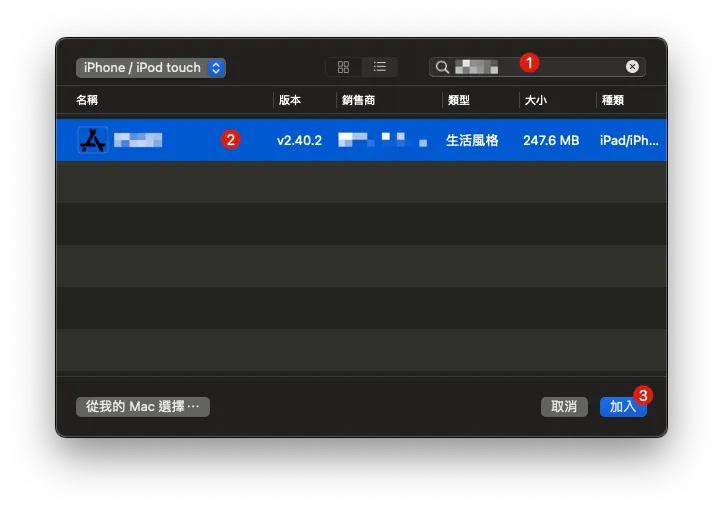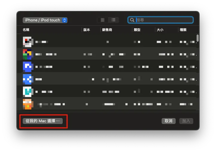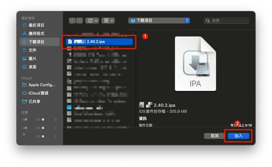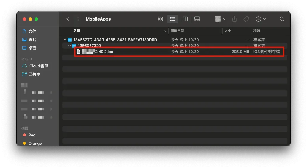 就可以找到下載下來正準備要安裝的目標 App .ipa 檔案: