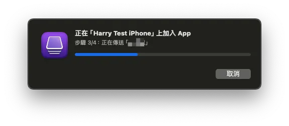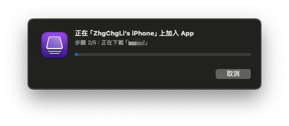 此時會出現等待視窗,正在 XXX 上加入 App、正在下載「XXX」。