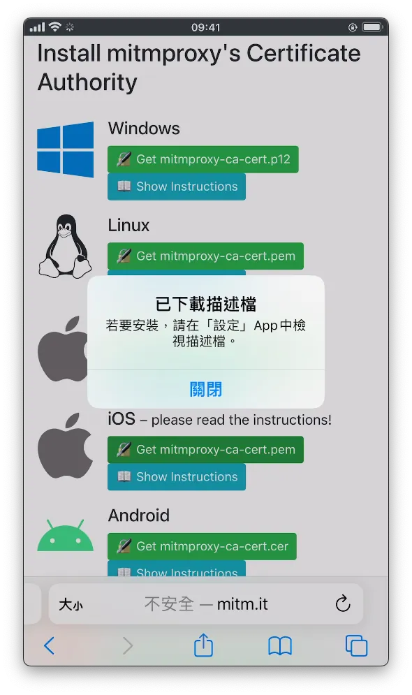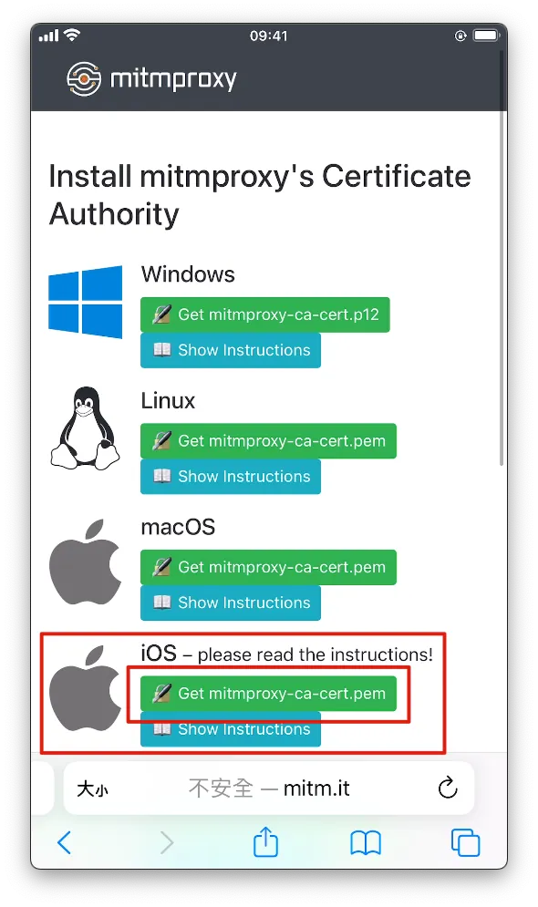 代表連接成功,我們找到 iOS 區塊點擊「Get mimproxy-ca-cert.pem」