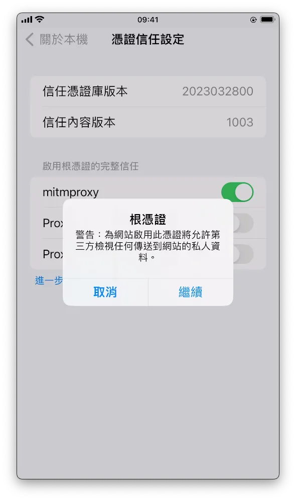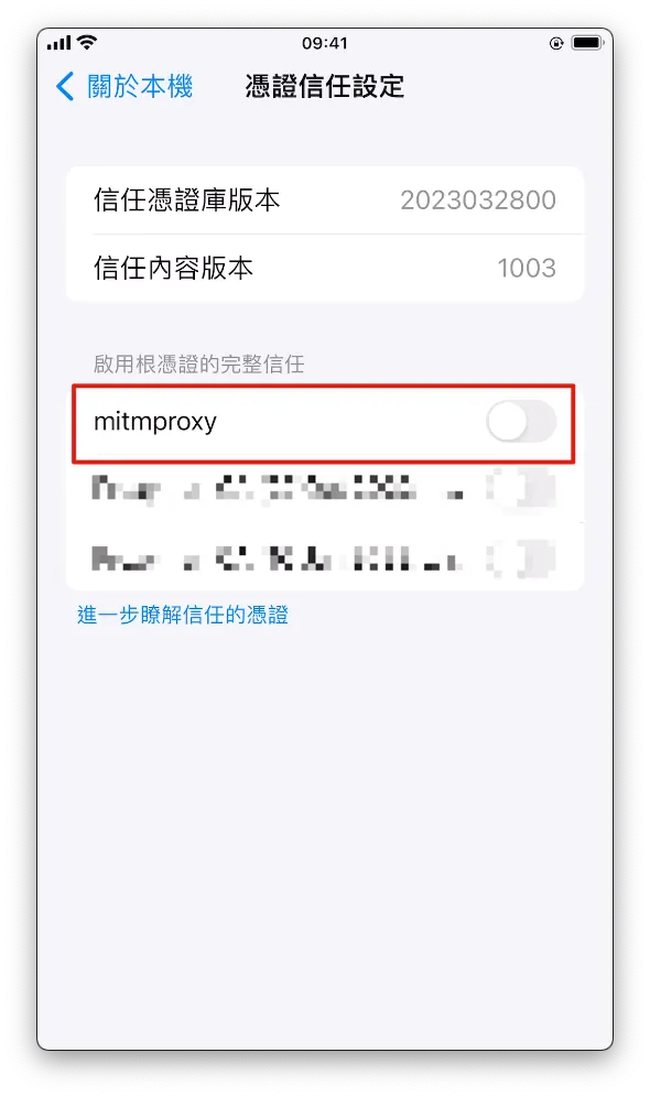 回到設定 -> 「一般」->「關於本機」-> 最下方「憑證信任設定」-> 啟用「mitmproxy」。