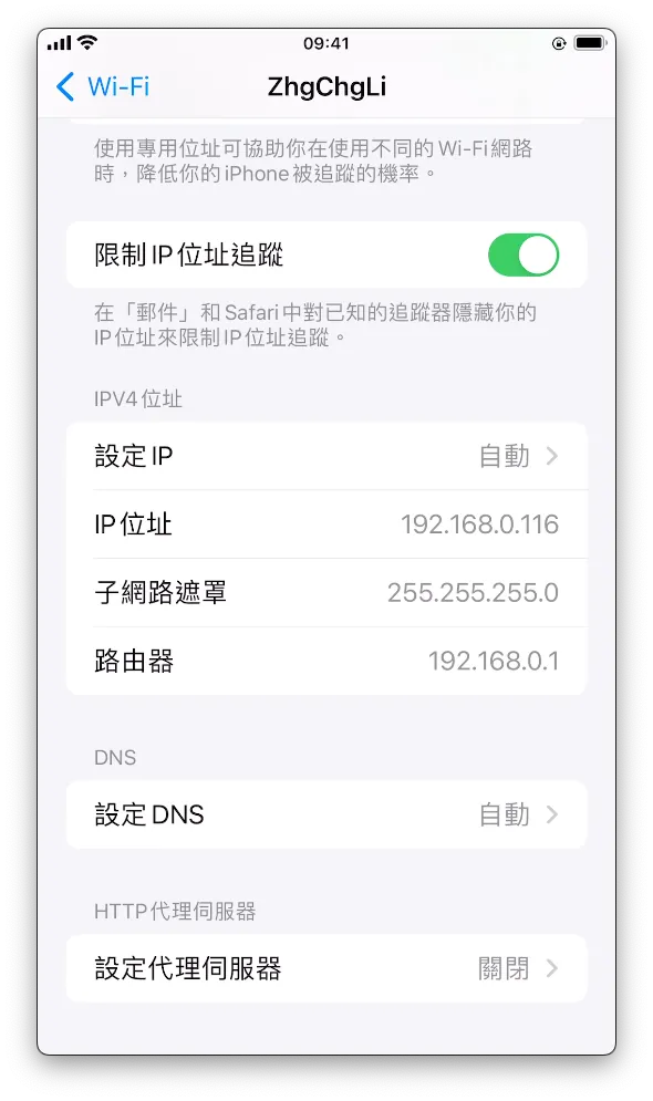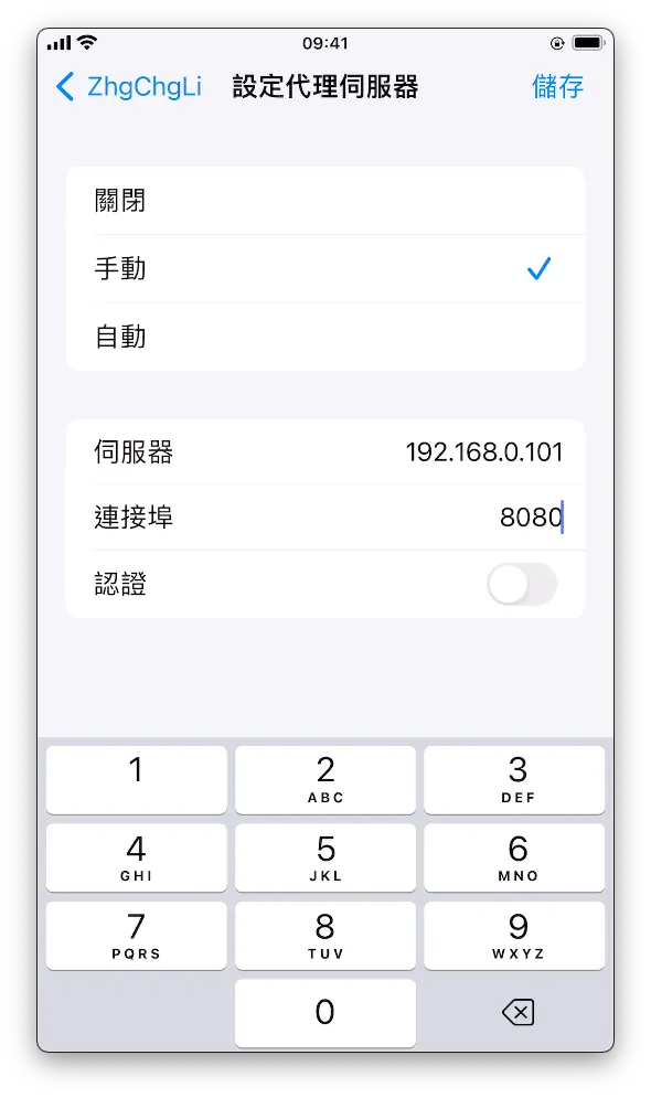 回到手機 WiFi 設定點擊「i」進入詳細設定,找到最下方「設定代理伺服器」: