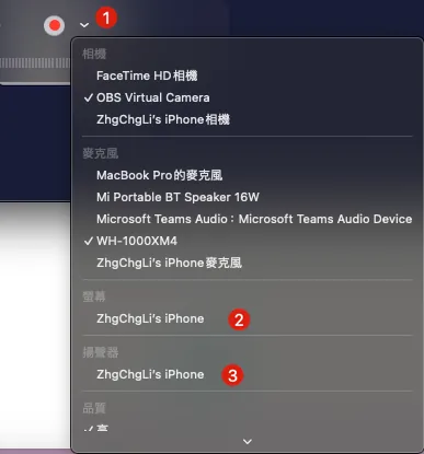 3. 跳出錄影介面後點擊 🔴 旁的「v」,螢幕與揚聲器選擇您接上的手機