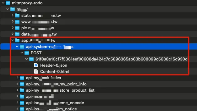邊操作的同時,就能看到輸出目錄會有很多擷取下來的 API Response Data,會照著 Domain -> API 路徑 -> HTTP 方法 -> Hash 值 -> Header-X / Content-X 存放(若相同 Hash 請求兩次,會按照順序儲存下來)。
