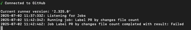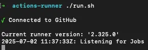 出現 √ Connected to GitHub、Listening for Jobs 就代表已經在監聽 Actions 任務了: