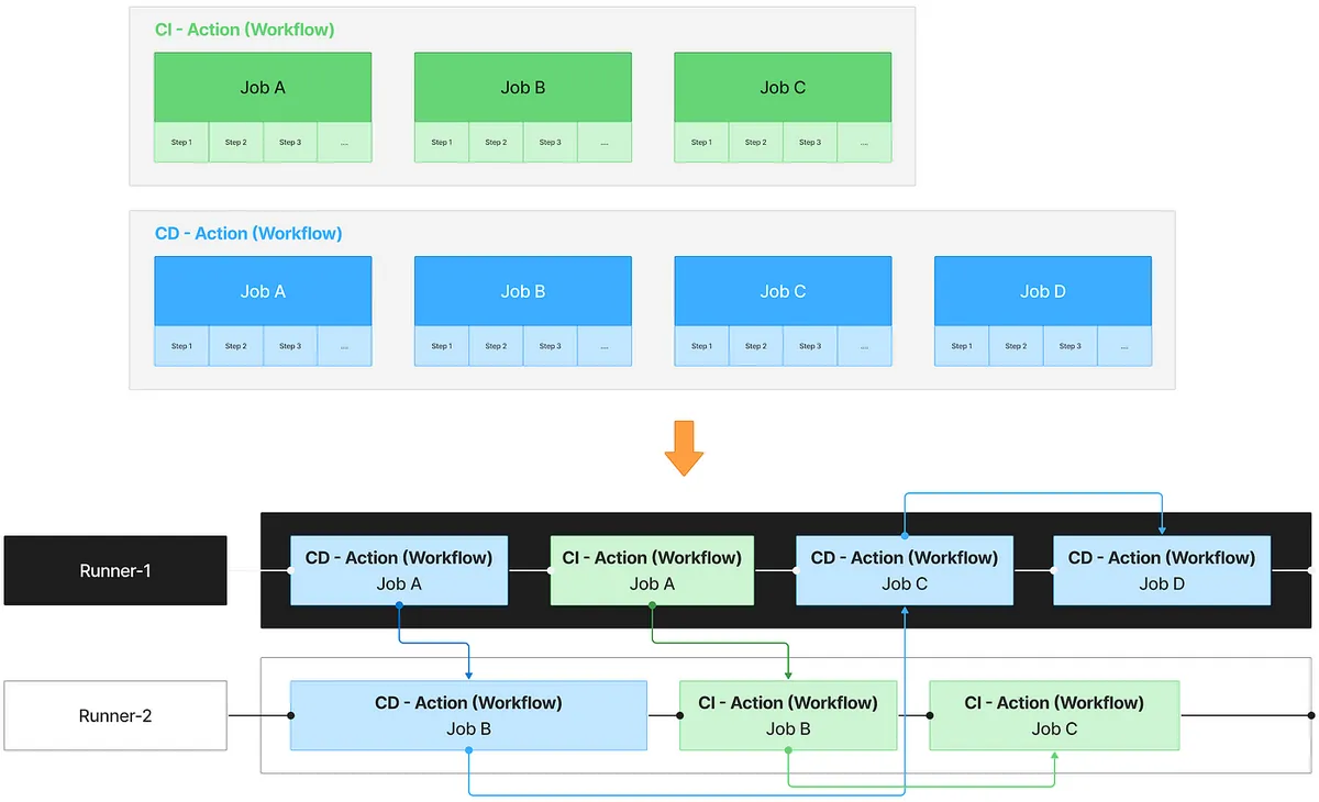 - 只關心 Job 不關心是哪個 Action(Workflow) 因此會出現 Action A 的 Job-1 執行完,下一個換 Action B 的 Job-1,而不是 Action A 的 Jobs 都執行完才換 Action B。