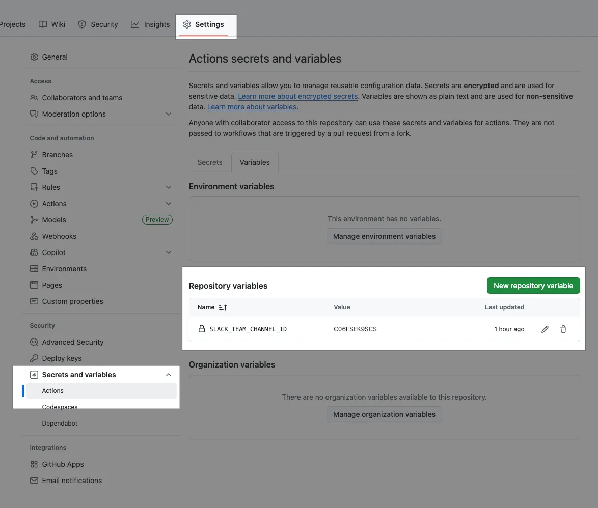 GitHub Repo — Actions Variables