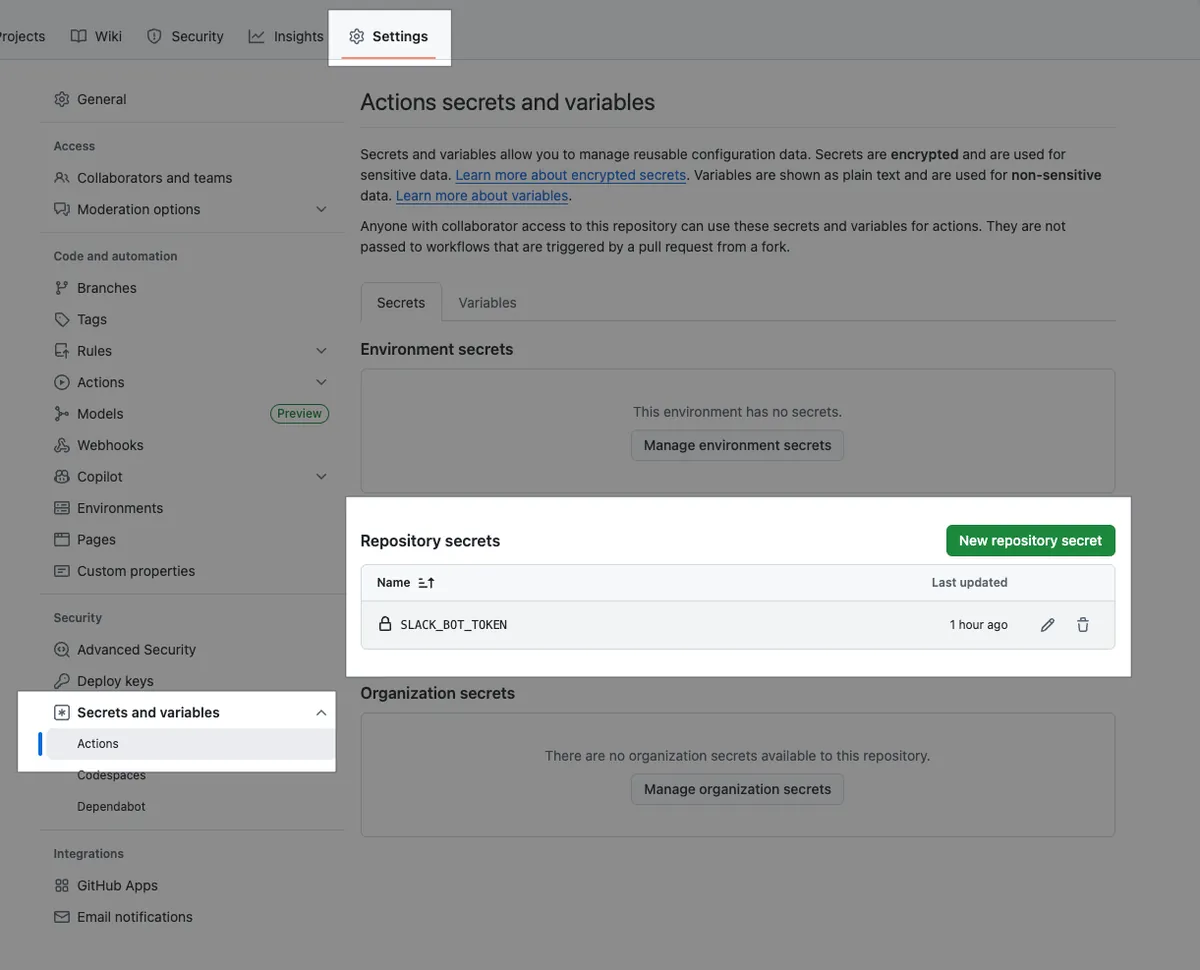 - 存放 Actions 步驟中會用到的 Secret Key, Token e.g. Slack Bot Token、Apple Store Connect API .p8 Key