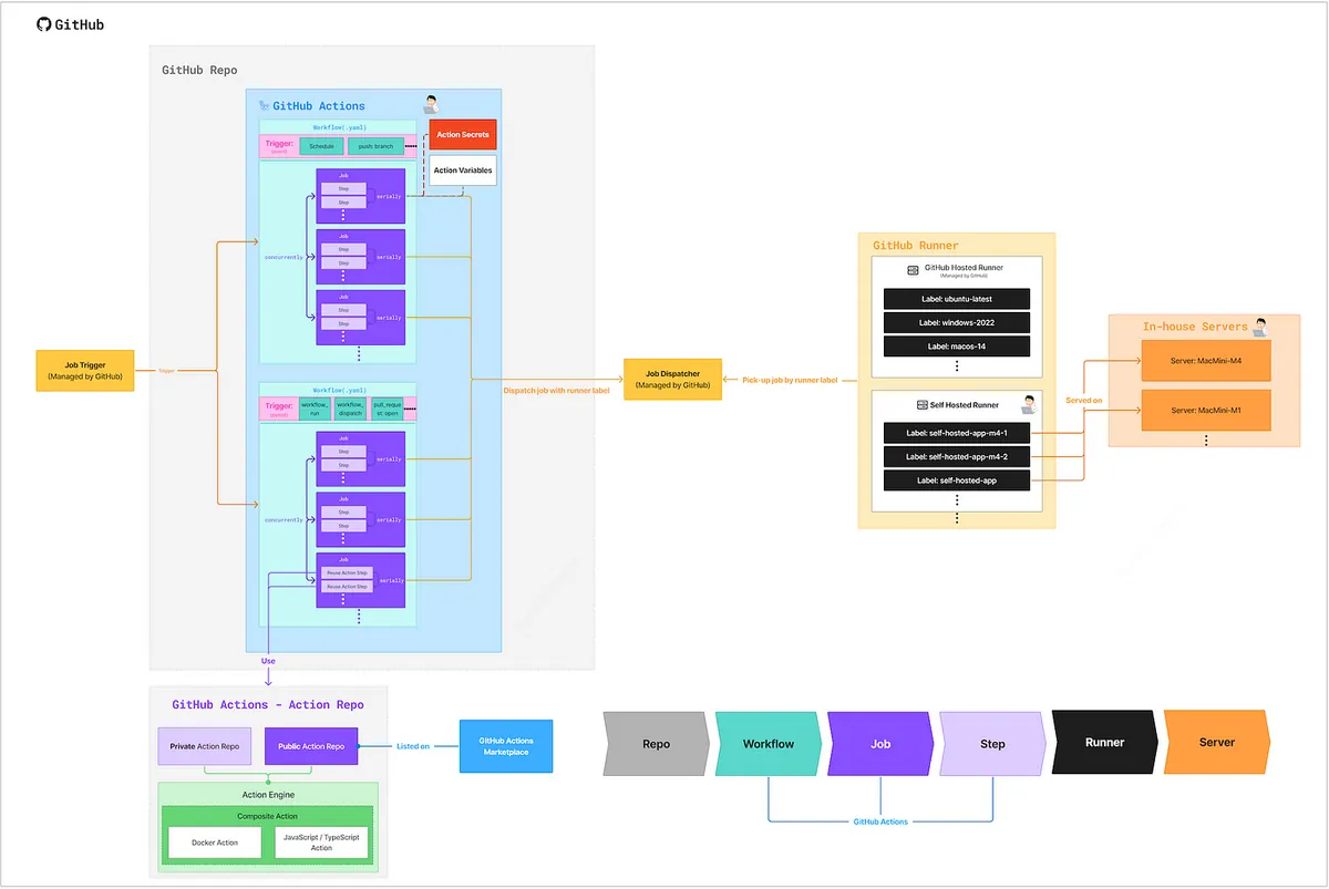 在開始之前我們先來確定一下 GitHub Actions 的運作架構流程關係與職責。