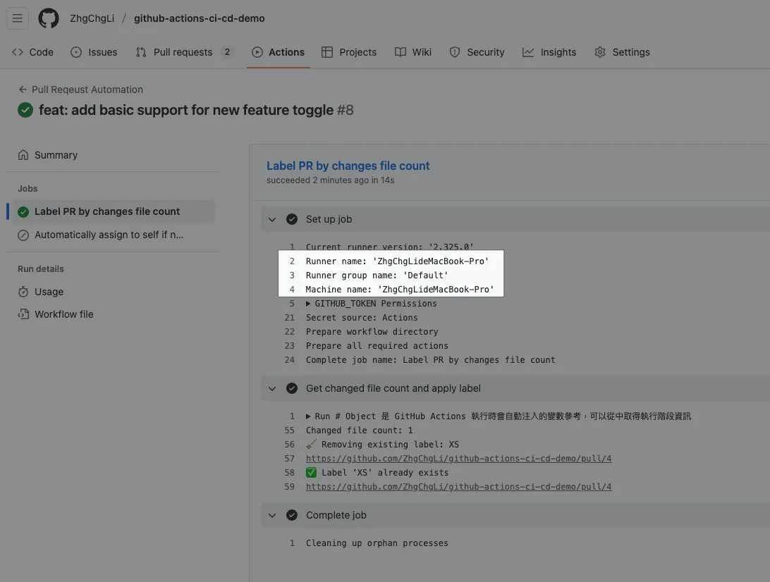 成功!現在這個任務就完全是使用我們自己的電腦在執行,不使用 GitHub Hosted Runner、不計費使用。