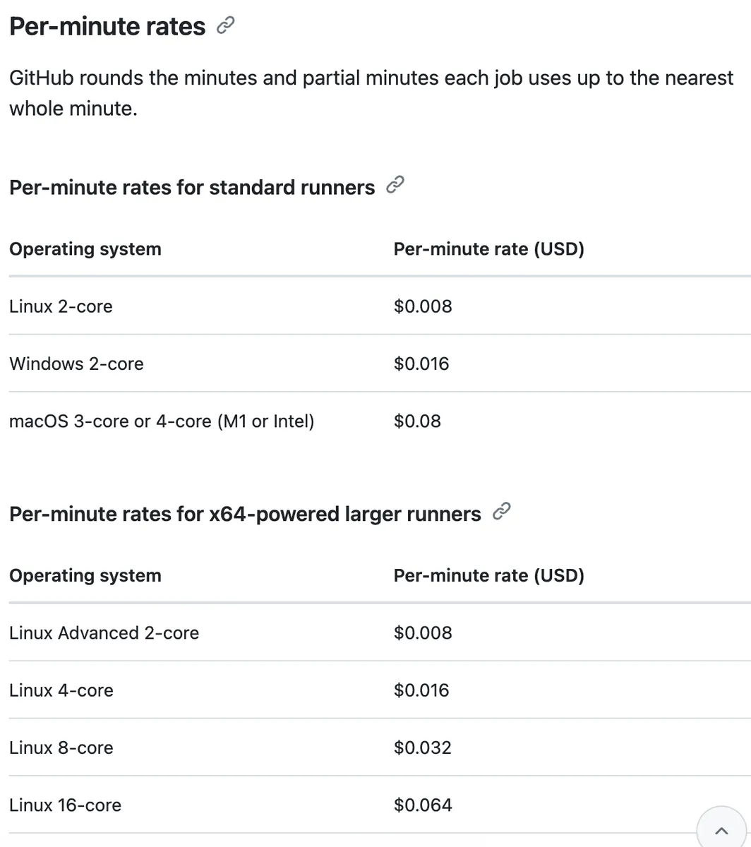 - ⚠️️Private Repo 計費方式: 超過免費額度之後開始用用量計費(可設上限跟通知),依照 Runner 所屬的機器作業系統、核心不同,價格也不同: