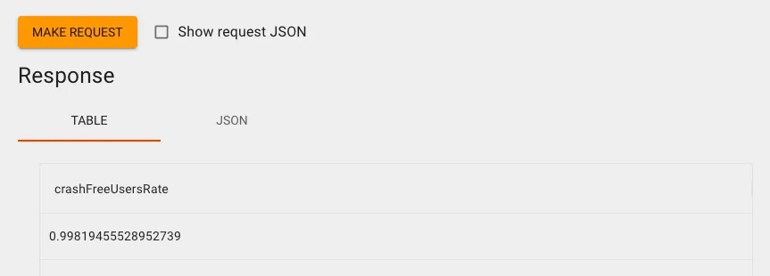 拉到最下面點擊「Make Request」查看結果,我們就能得到指定日期範圍內的 Crash-Free Users Rate。