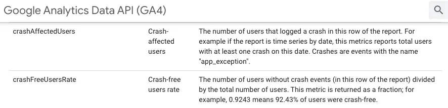 一開始我以為這個數據同樣能從 Big Query 查詢出來;但其實這方向完全錯誤,因為 Big Query 是 Crash 的 Raw Data,不會有沒有閃退的人的數據,因此也算不出 Crash-Free Users Rate;關於這個需求在網路上的資料不多,查詢許久才找到有人提到 Google Analytics 這個關鍵字;我知道 Firebase 的 Analytics、Event 都能串到 GA 查詢使用,但沒想到 Crash-Free Users Rate 這個數據也包含在內,翻閱了 GA 的 API 後,Bingo!
