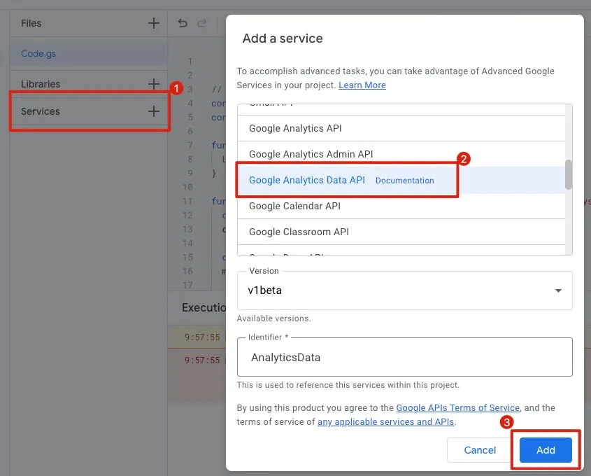 在左方的「Services」點「+」加上「Google Analytics Data API」。