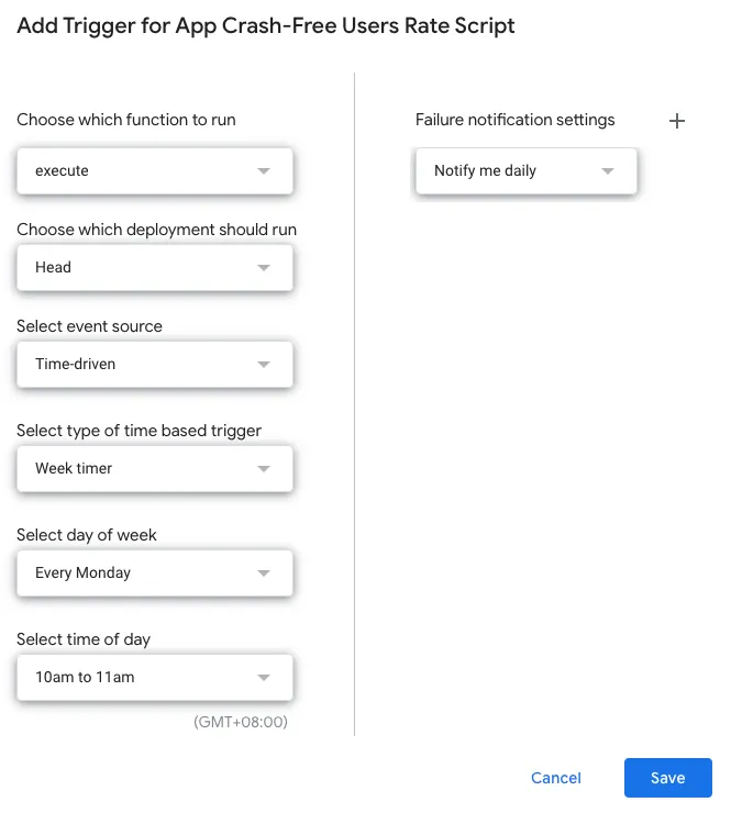 p.s. 不同於上一篇使用 Big Query 需要花錢查詢資料,此篇查詢 Crash-Free Users Rate、Google Apps Script 都是完全免費,可以放心使用。
