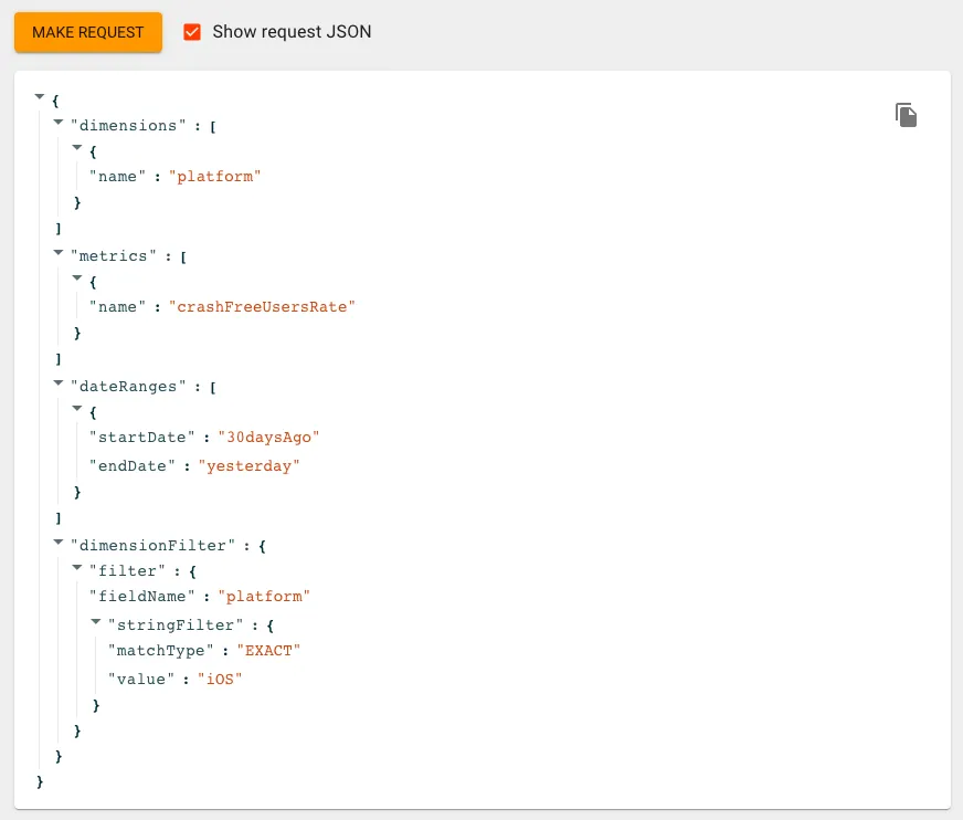 回到剛剛的 GA4 Query Explorer 工具,在 Make Request 按鈕旁邊可以勾選「Show Request JSON」取得此條件的 Request JSON。