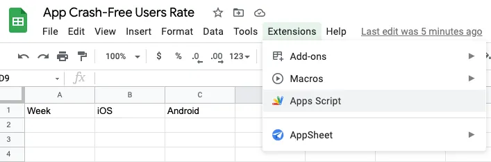 再來就是自動化的部分,我們將使用 Google Apps Script 查詢 GA Crash-Free Users Rate 數據後自動填入到我們的 Google Sheet 表單;已達自動填寫、自動追蹤的目標。