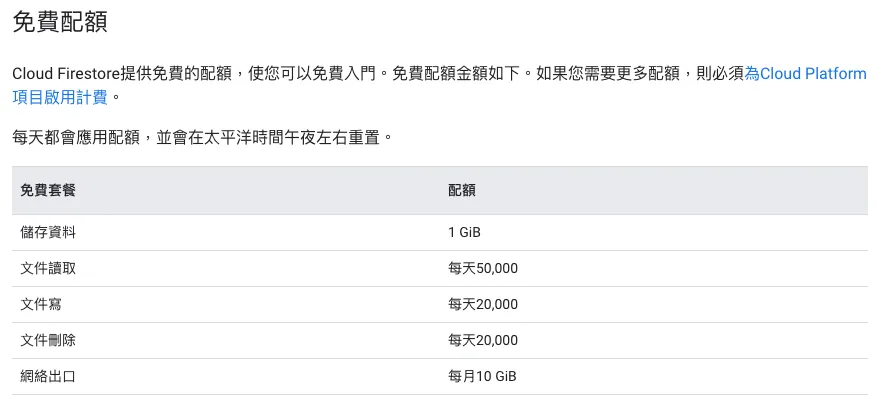Refer to the official pricing information: 1 GB storage, 10 GB monthly bandwidth, 50,000 reads per day, 20,000 writes/deletes per day; enough for light use!