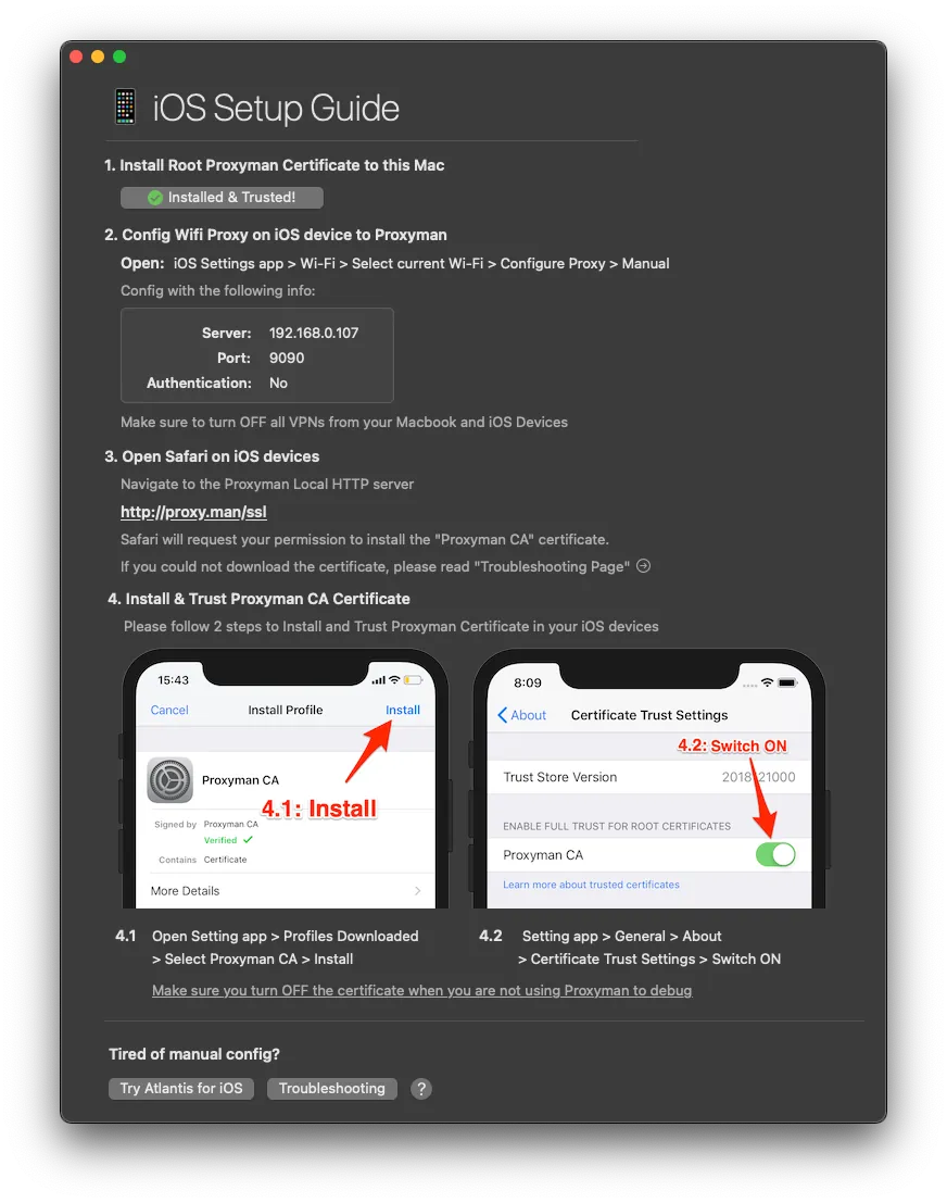 Set up the proxy on your phone as instructed, then complete the certificate installation and activation.