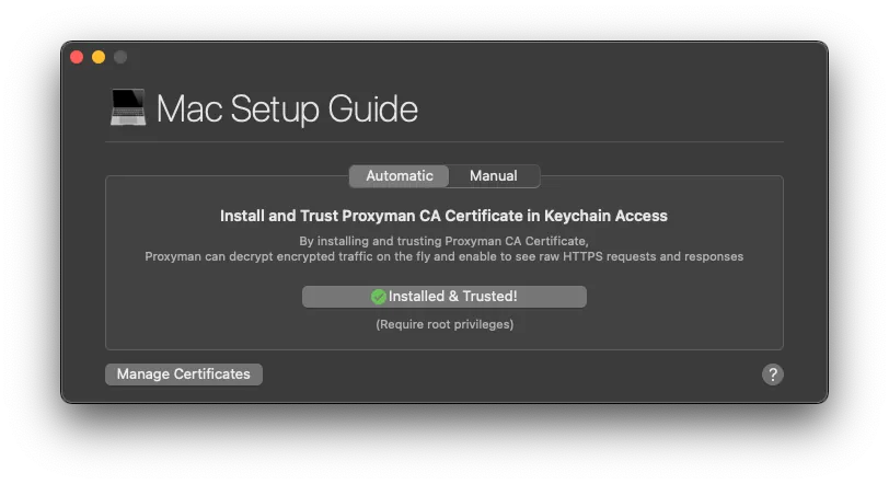 After downloading, launch Proxyman and install the Root certificate (to perform a Man-in-the-Middle attack to decrypt HTTPS traffic).