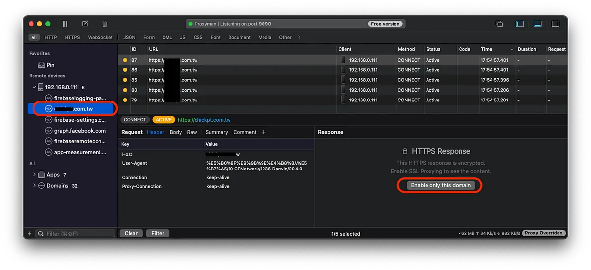 At this point, Proxyman on the Mac will show the sniffed traffic. Click on the device IP and then the APP API domain you want to check; the first time you view it, you need to click “Enable only this domain” before the traffic can be unpacked.