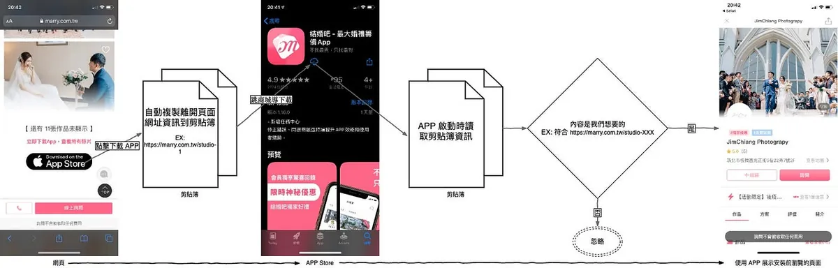 The main reason the app reads the clipboard on launch is to implement iOS Deferred Deep Link to enhance user experience, as shown in the above process. When a product offers both a website and an app, we prefer users to install the app (due to higher engagement). Therefore, when users browse the web version, they are guided to download the app, and we want the app to automatically open the page they left off on when launched after installation.