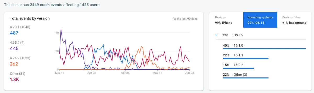 Since the release of iOS 15 last year, an app has consistently been plagued by a crash issue. According to data from the past 90 days (2022/03/11~2022/06/08), it caused over 2.4K crashes, affecting more than 1.4K users.