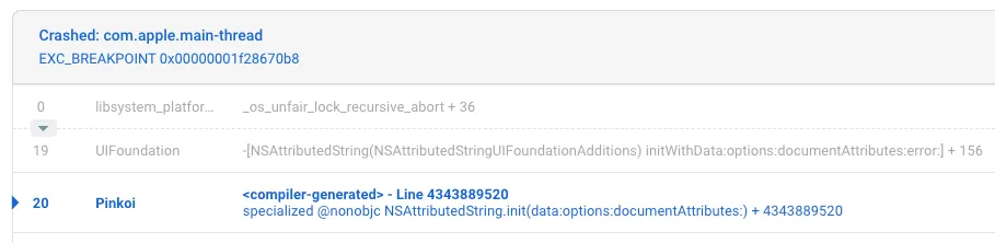 NSAttributedString crashes during init with Crashed: com.apple.main-thread EXC_BREAKPOINT 0x00000001de9d4e44.