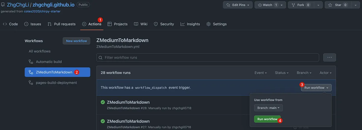 Actions -> ZMediumToMarkdown -> Run workflow -> Run workflow.