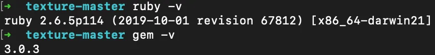 In Terminal, enter ruby -v to check the current Ruby version, and gem -v to check the current RubyGems version: