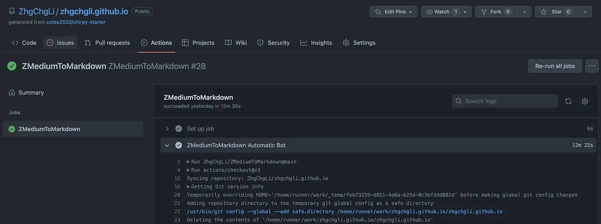After execution, ZMediumToMarkdown will directly run the script on Github Action’s machine to sync Medium articles to the Repo:
